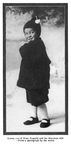 He showed a certain pride in learning even a few Japanese words which could be understood by the people round him. And he has made it his own office to sit down like a Japanese and say “sayonara” when a guest leaves the house, and he is happy to do it. He shouted “banzai” for the first time the day when my brother brought him two paper flags, one of them being, of course, Japanese, while the other was an American one. “You Japanese baby?” Leonie asked him. “Yes,” he replied, turning to me. And when I asked him how he would like to remain as an American, he would turn to my wife and say “Yes.” Indeed, I wish he will grow up as an American as well as a Japanese. He was the cause of no small sensation among the Japanese children of this Koishikawa district at least; his foreign manner and Western tint, and also the point of his having a Japanese father, made him a wonderful thing to look at for the children around here, while they felt some kinship with him. The fame of Isamu spread over many miles; even a jinrikisha man far away will tell you where “Baby San” lives, although Noguchi’s name may mean nothing to his ear. The children think, I am sure, that “baby” is his own name, and whenever they pass by our house morning or evening, they will shout loudly “Baby San.” And Isamu will rarely miss a chance to run out and show himself to answer. Why, this little fellow is quite vain already. And the children who caught the word of “Mama” spoken by Isamu to his mother, thought that it was Leonie’s name. I am told by her that she was frequently startled by a shout of “Mamma San” from behind on the street. I feel happy to see that he began to play with the Japanese children. We have a little play called Mekakushi; many children will make a large ring with their joined hands and choose a child to let him stand in the middle of the ring with his eyes covered with his palms. Mekakushi means “eyes hidden.” The child at the center will walk to the ring, and touch any child, and tell its right name; and then the child who was told its own name will take a turn to be in the middle. It happened one evening that our Isamu was obliged to stand in the center; it was clear to see his bewilderment, since he never knew the children’s real names. But accidentally Leonie passed by on her way home; he took advantage of the chance at once and called out loudly: “Mama, mama!” I am not told whether my wife filled her duty to stand in the middle or not; however, we talked about it afterward, and laughed.