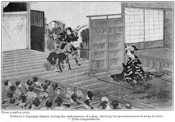 Japanese theatre during the performance of a play, showing the spectators stowed away in their little compartments.